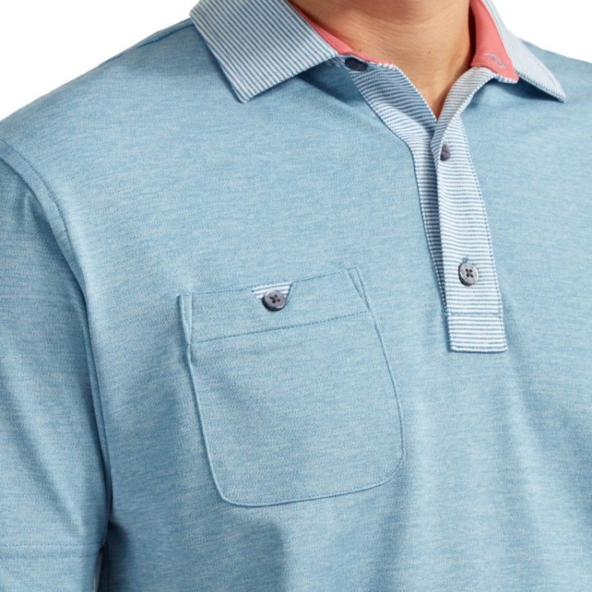 杢調ボディ、ピンストライプのセットオン前立てと襟付き。着用者の胸ポケット 適切なカラー コーディネート 後ろヨーク Fj ロゴ コントラストカラー スタンド 吸湿発散性テクノロジーが体から湿気を逃がす