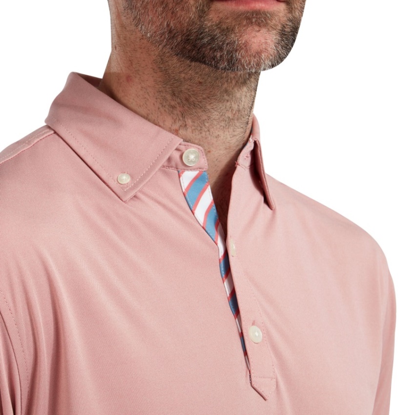 全体にバーズアイ生地、前立てと襟の内側にストライプのコントラストのディテール、襟のボタンダウン、同系色の後ろヨークに Fj ロゴの水分ウィッキング テクノロジーが体から湿気を逃がします
