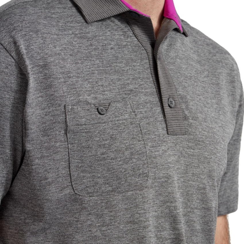 杢調ボディ、ピンストライプのセットオン前立てと襟付き。着用者の胸ポケット 右のカラー コーディネート 後ろヨークの Fj ロゴ コントラスト カラー スタンド 吸湿発散性テクノロジーが体から湿気を逃がします